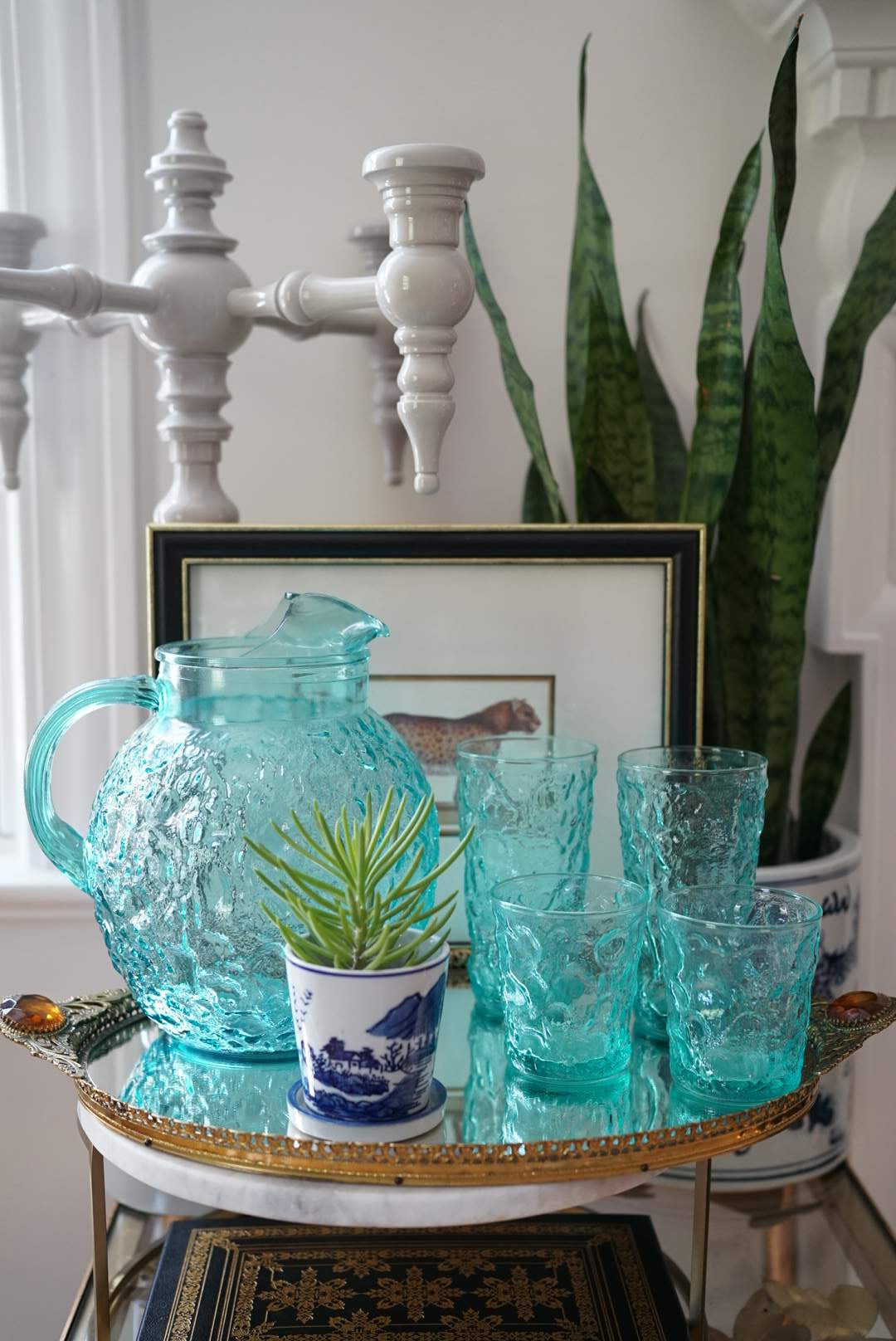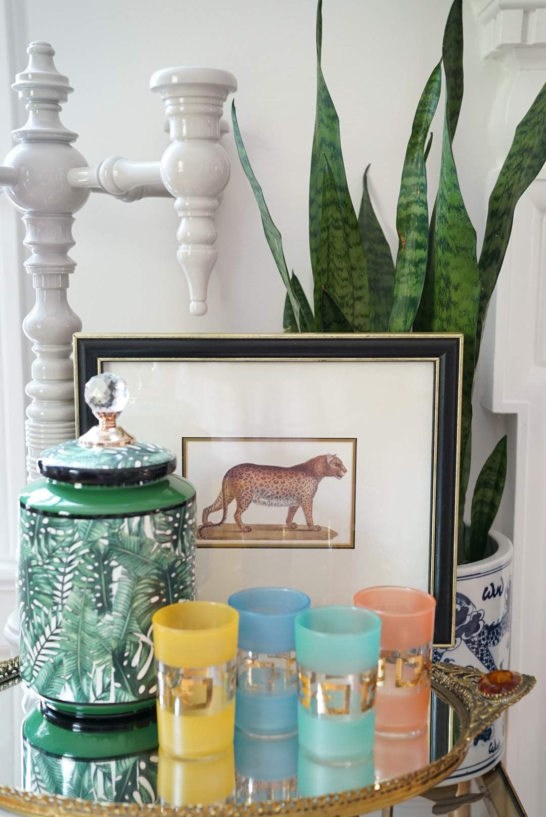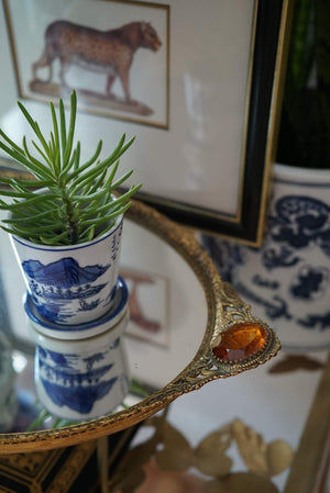 - A large regency mirror vanity tray with gorgeous details and a touch of amber color glass decorated handles.