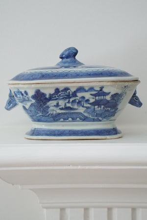 Antique Blue Canton Sauce Tureen with Boar Handles