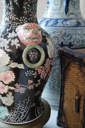 - A beautiful famille noire vase with unusual lion head handles and hand painted floral details, which makes a charming marriage of strength and grace.
