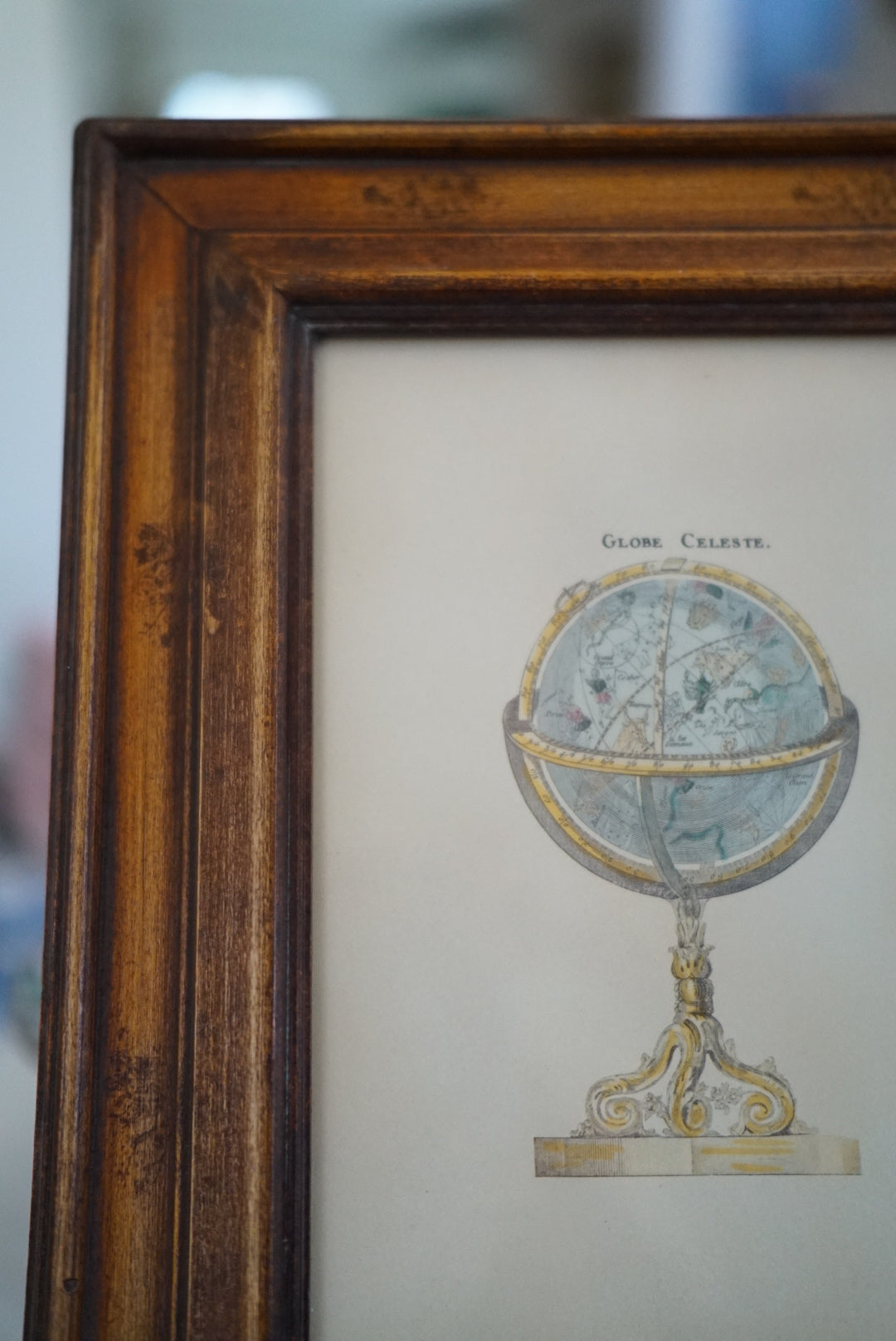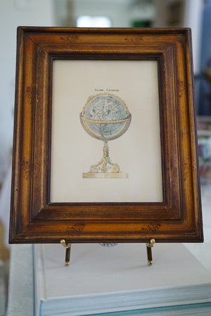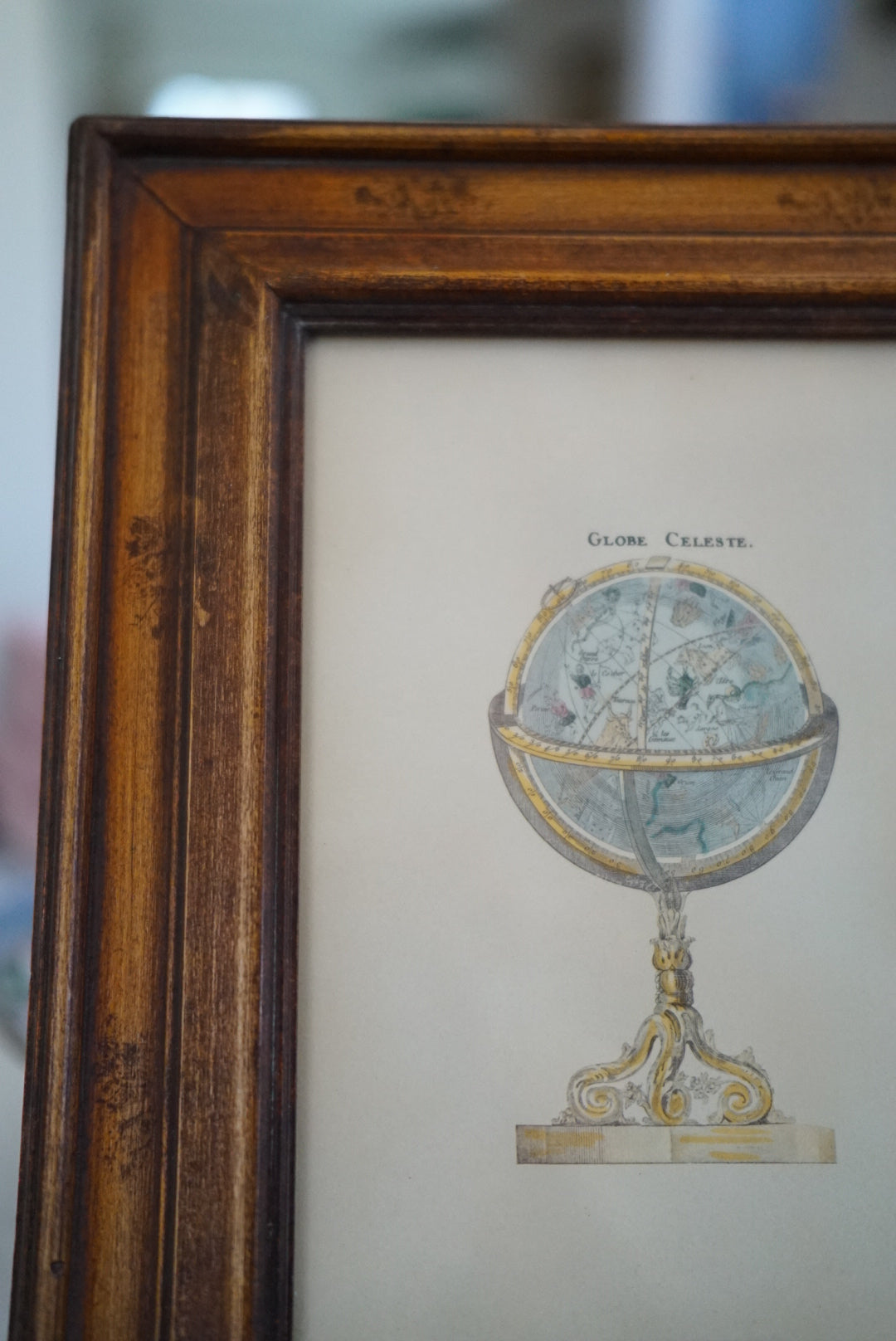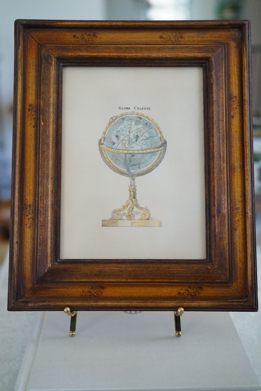 - A sophisticated vintage print of globe celeste in a wooden frame and glass cover.
