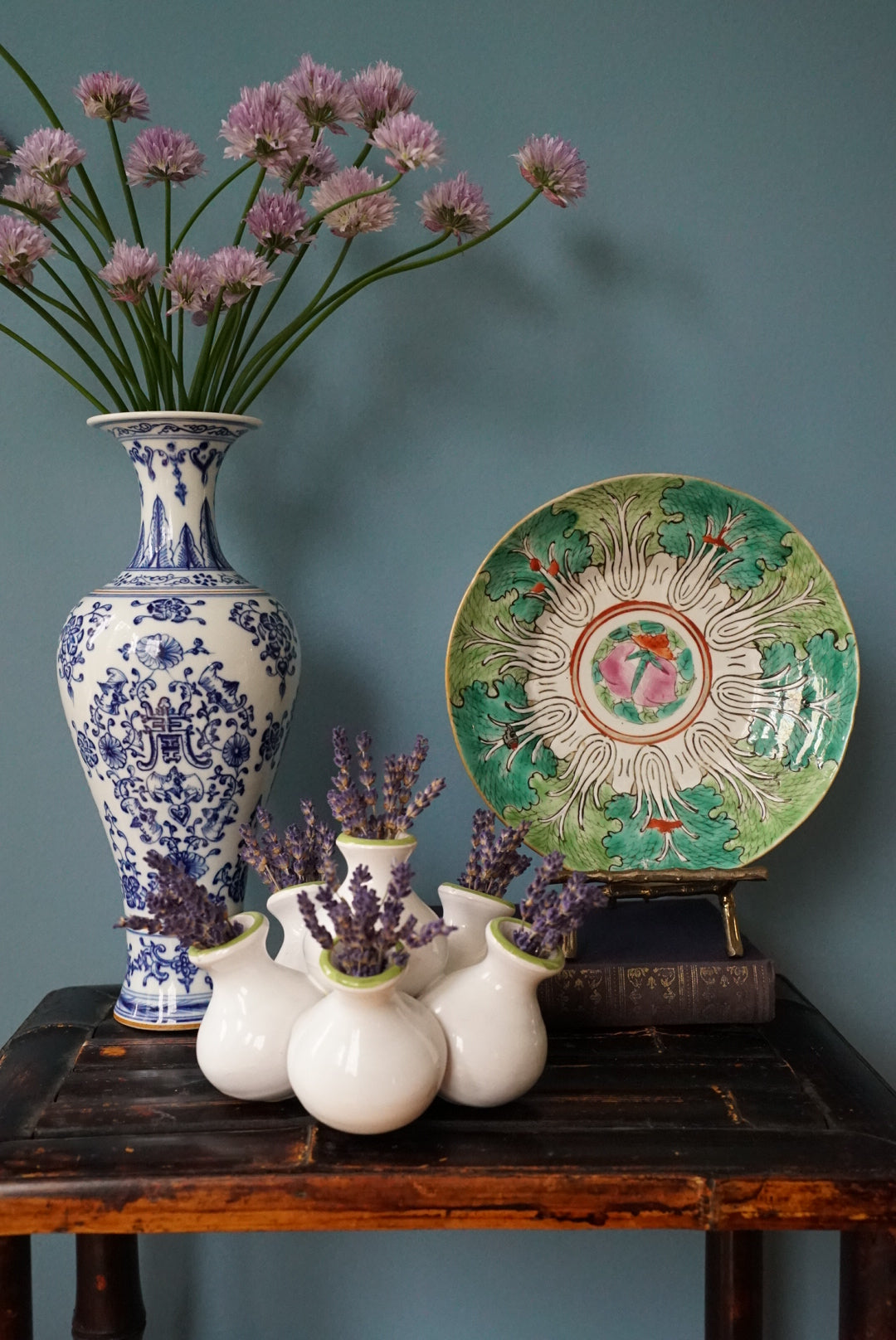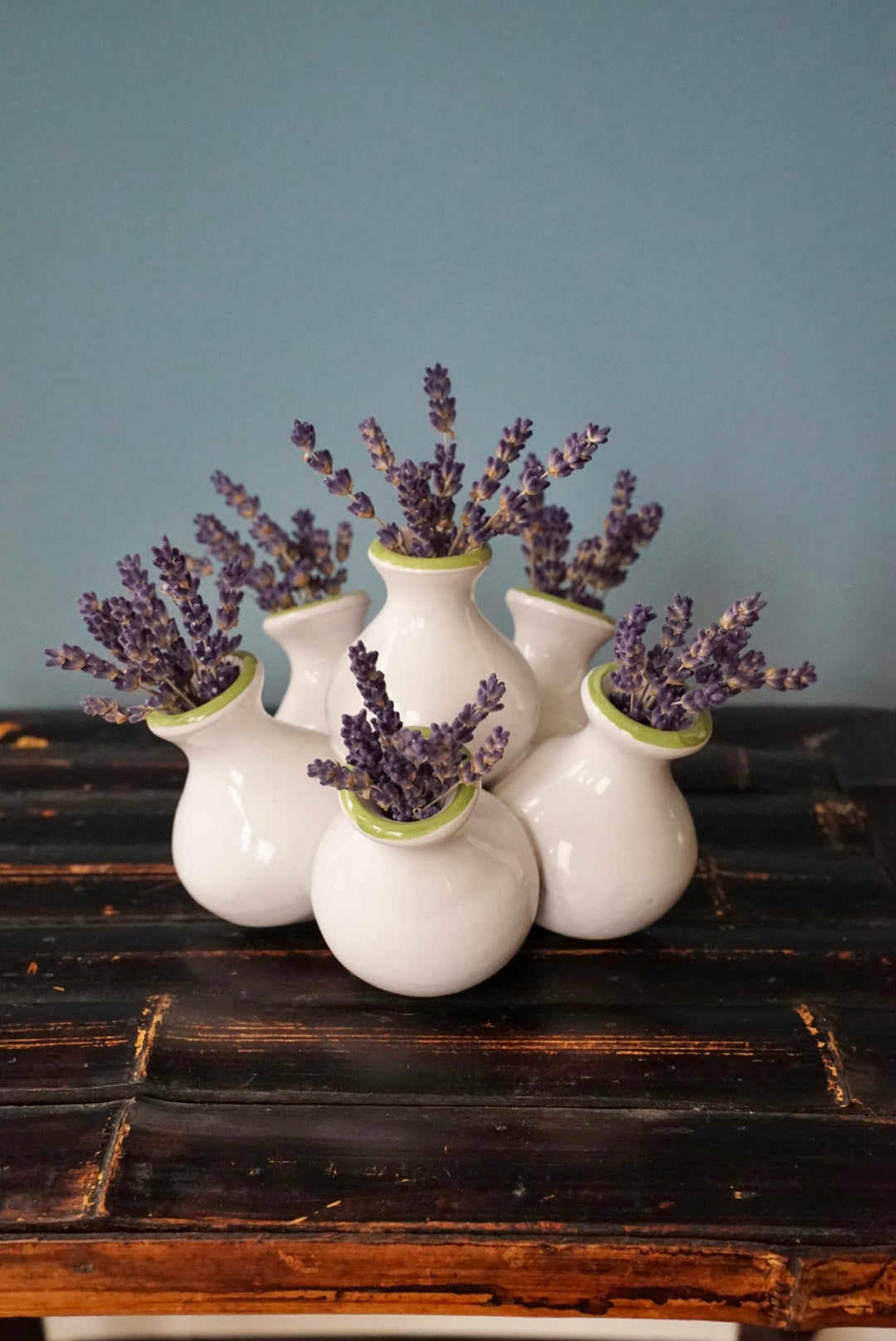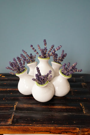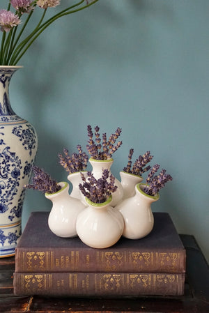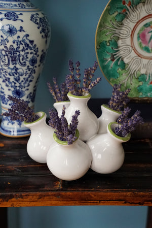 - A lovely center piece-worthy bud vase cluster. It’s an Italian vintage piece with white base and green color rim.