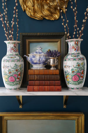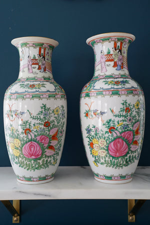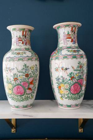 - A pair of gorgeous rose medallion vases with classic two large and two small beautifully hand painted panels of 4 robe figures and peonies/birds