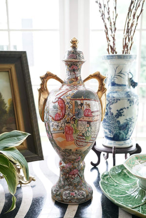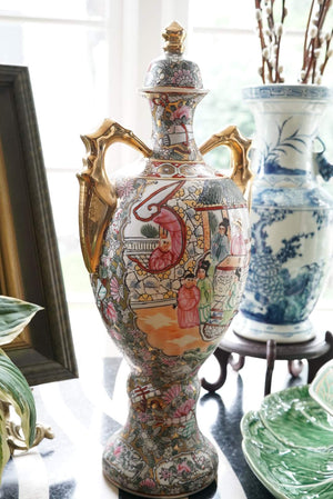 - An absolutely stunning rose mandarin trophy vase with amazing hand painting details. There are two repeating main mandarin panels front and back.