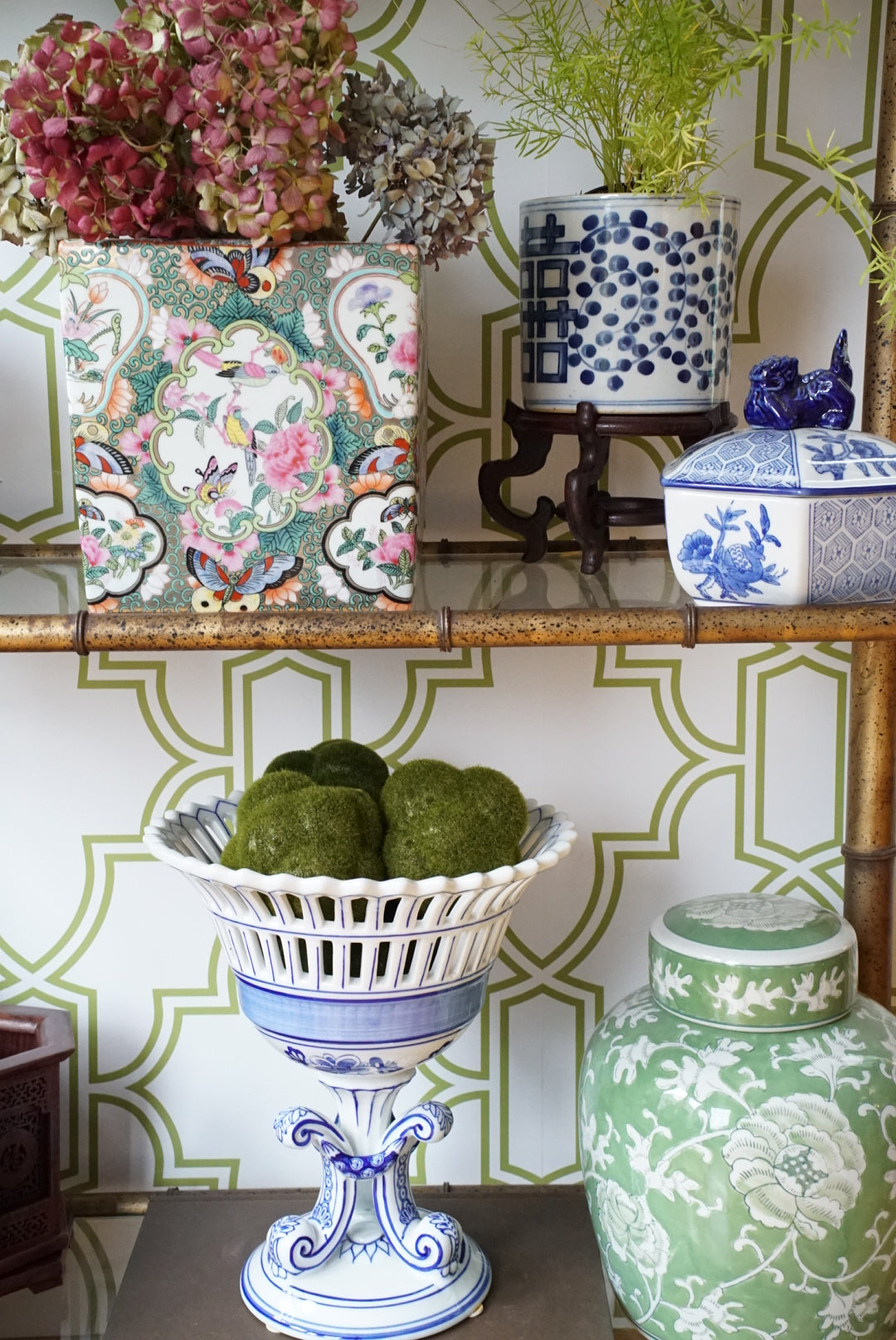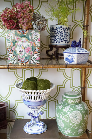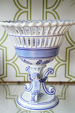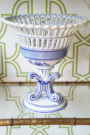 - Stunning vintage blue and white compote on an elegant pedestal with scroll details