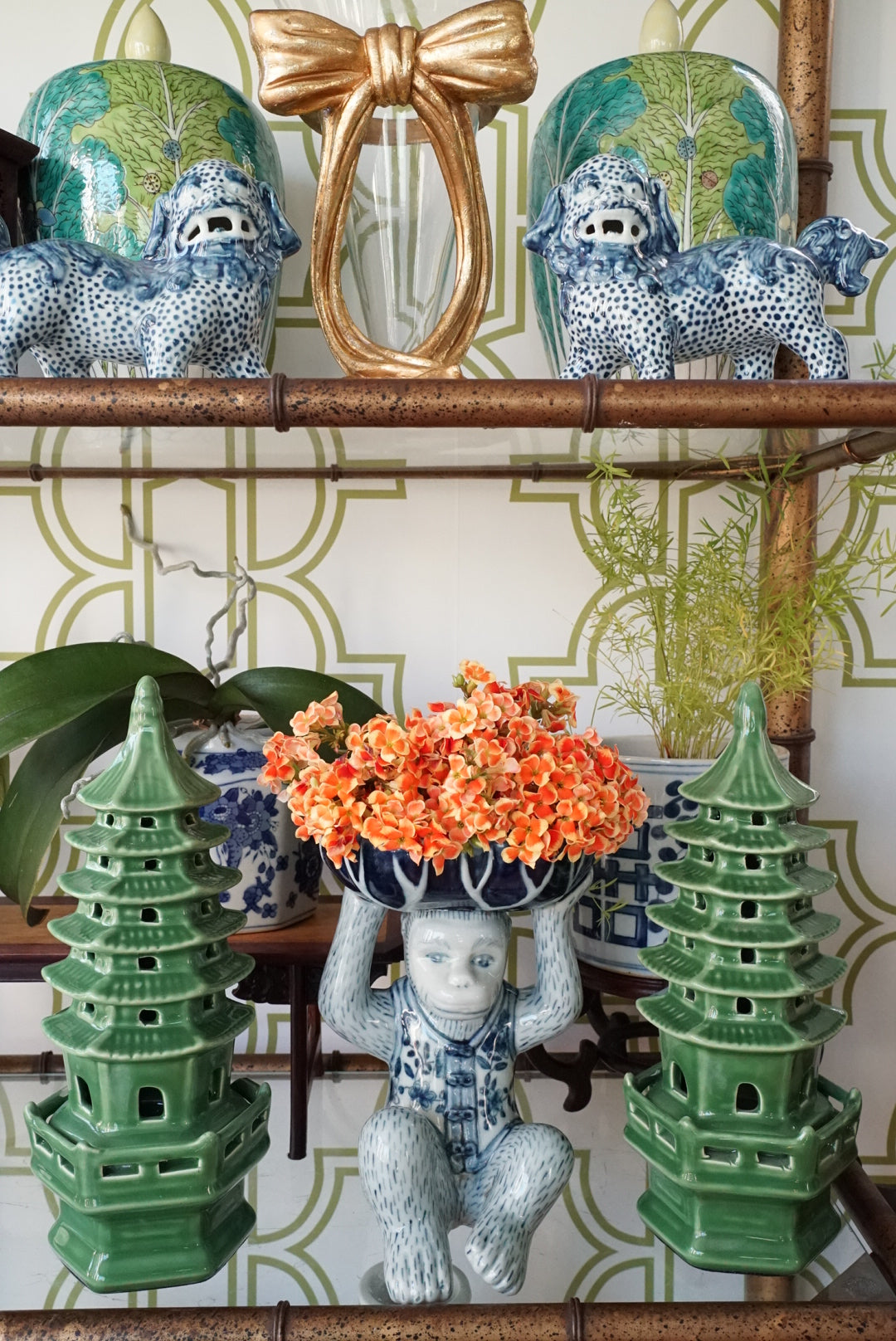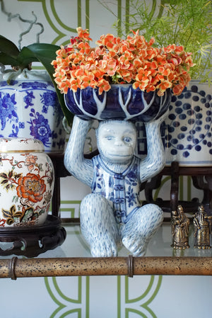 - A truly charming chinoiserie monkey in blue and white floral vest holding a cabbage bowl
