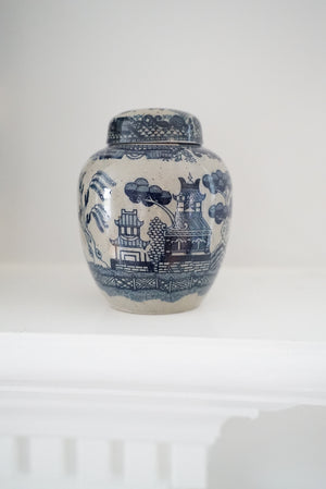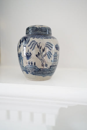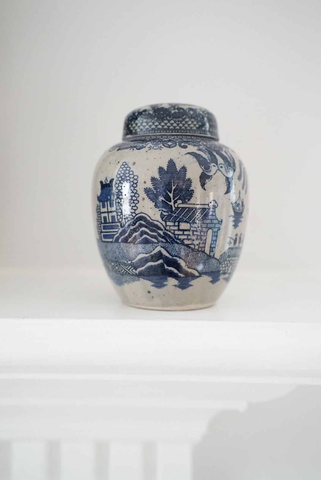 - Darling petite Ginger jar in the timeless blue willow pattern. Unmarked on the bottom.