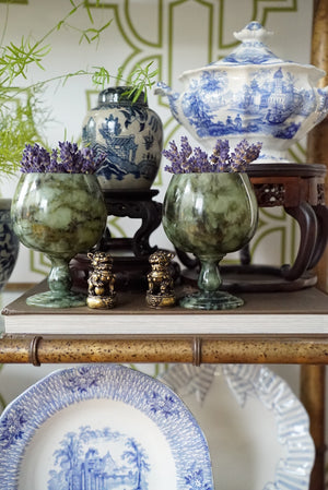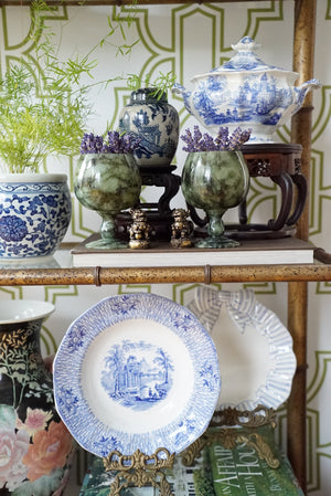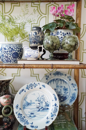 - It has a pottery style background which is not stark white and deep navy blue glaze