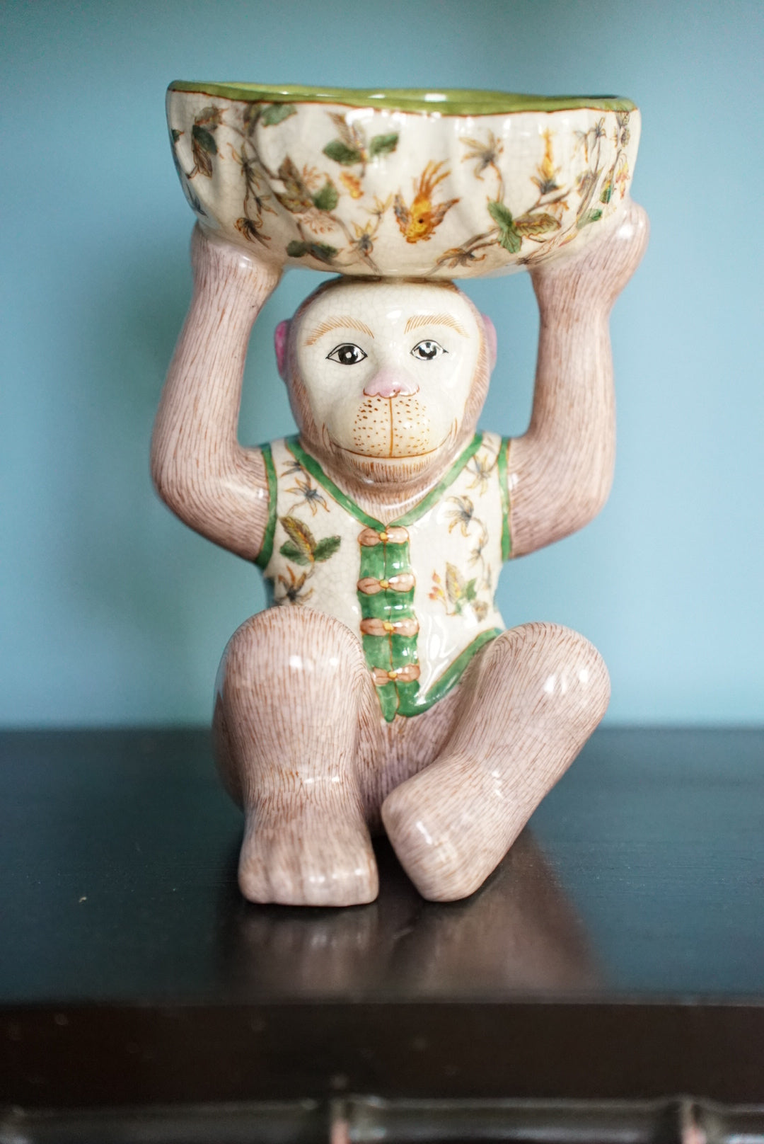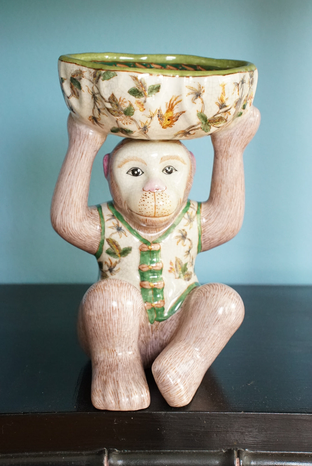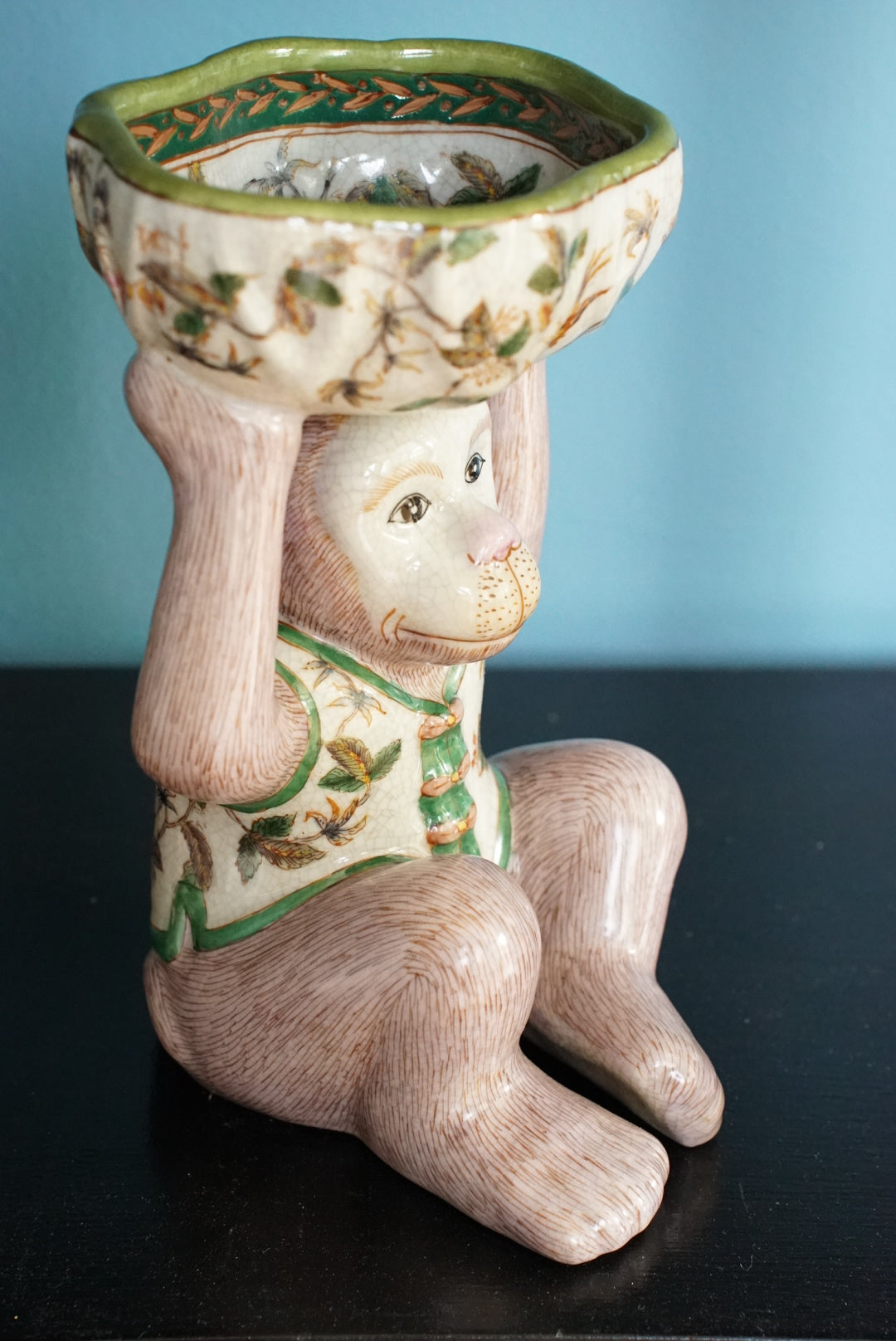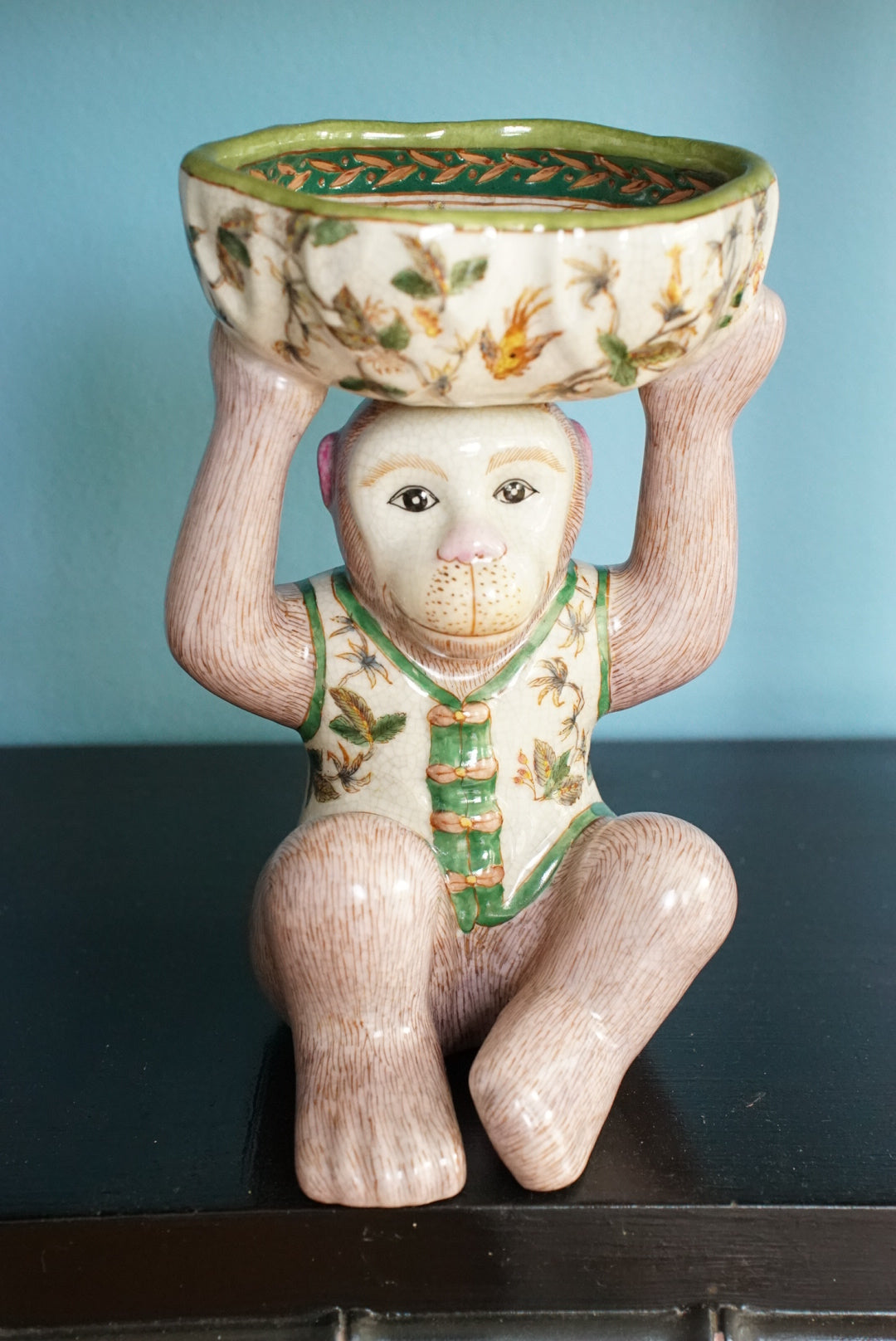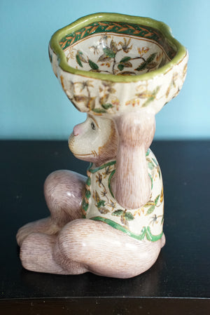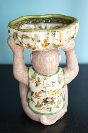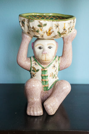 - An adorable mauve pink and green chinoiserie monkey holding a bowl