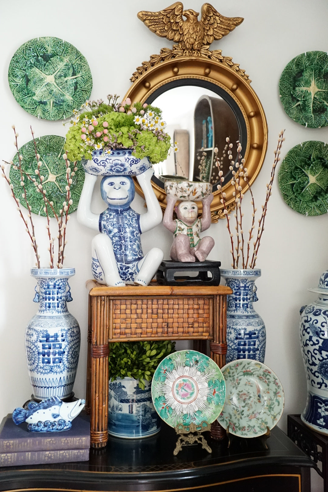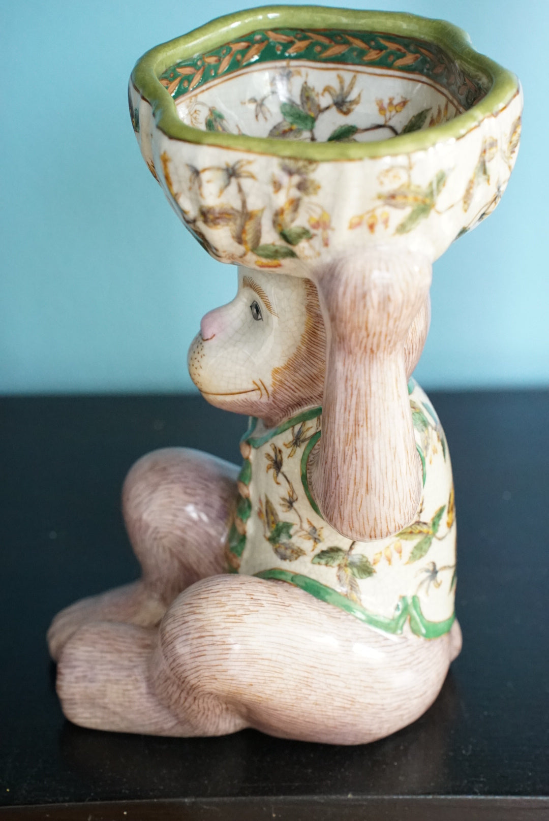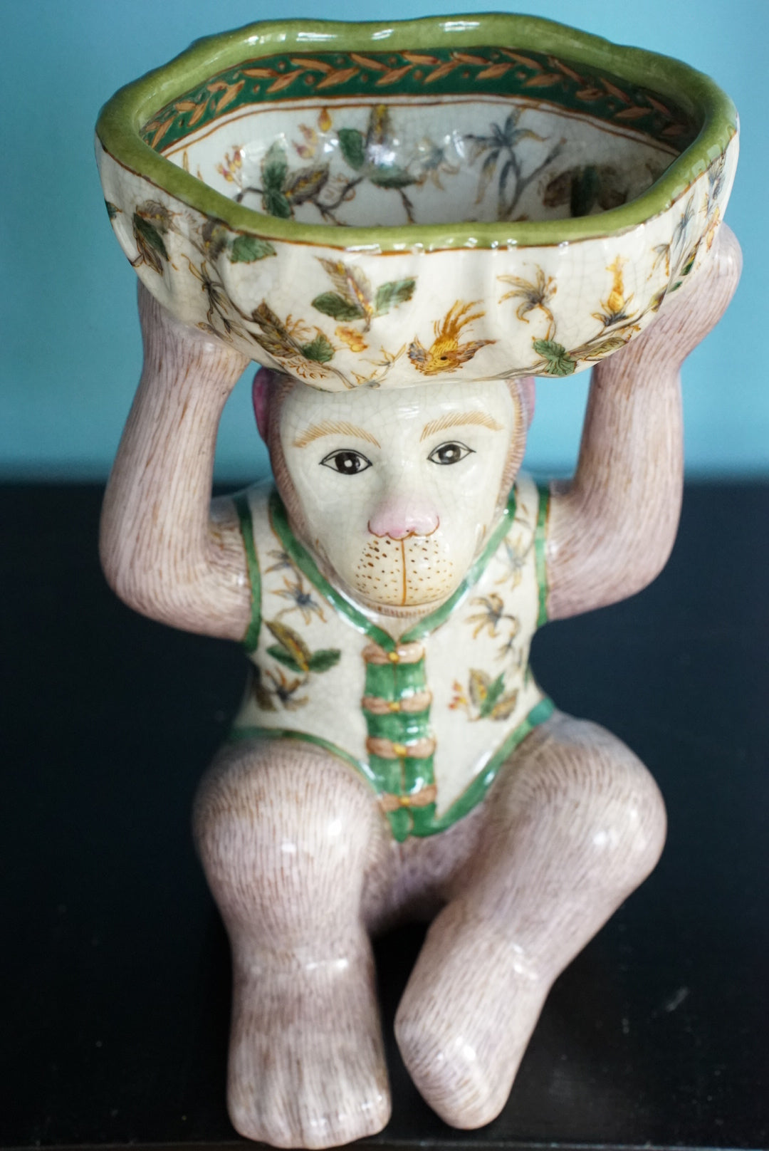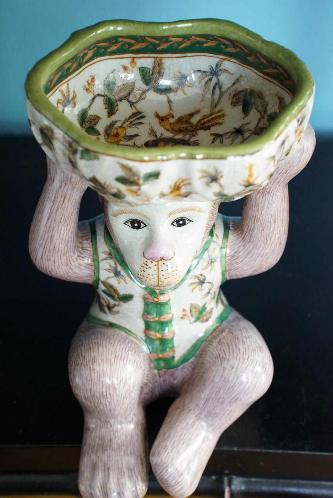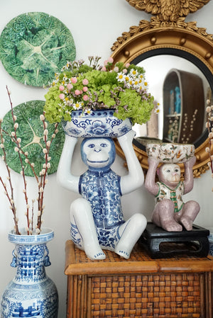 - An adorable mauve pink and green chinoiserie monkey holding a bowl