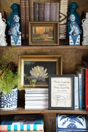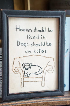 - Darling needlepoint reads “Houses should be lived in; dogs should be on sofa”