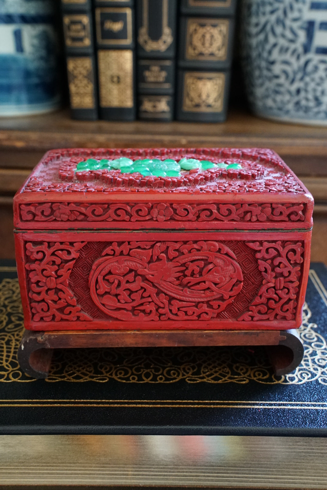 - A gorgeous cinnabar box embossed with jade decoration on lid