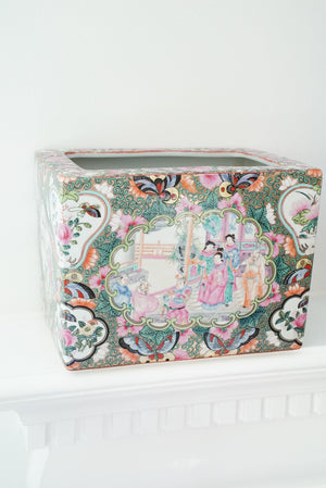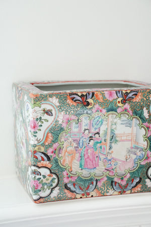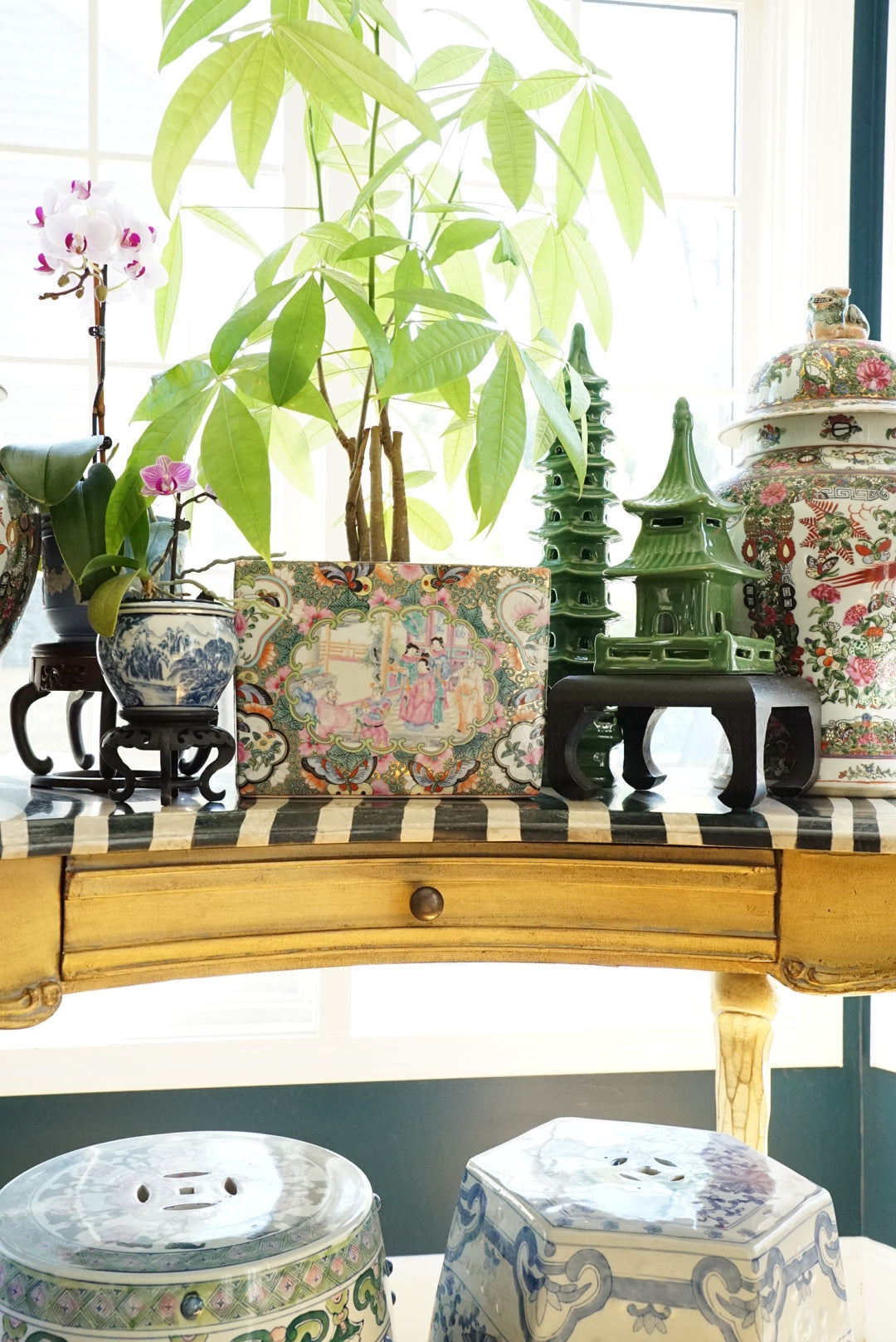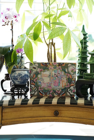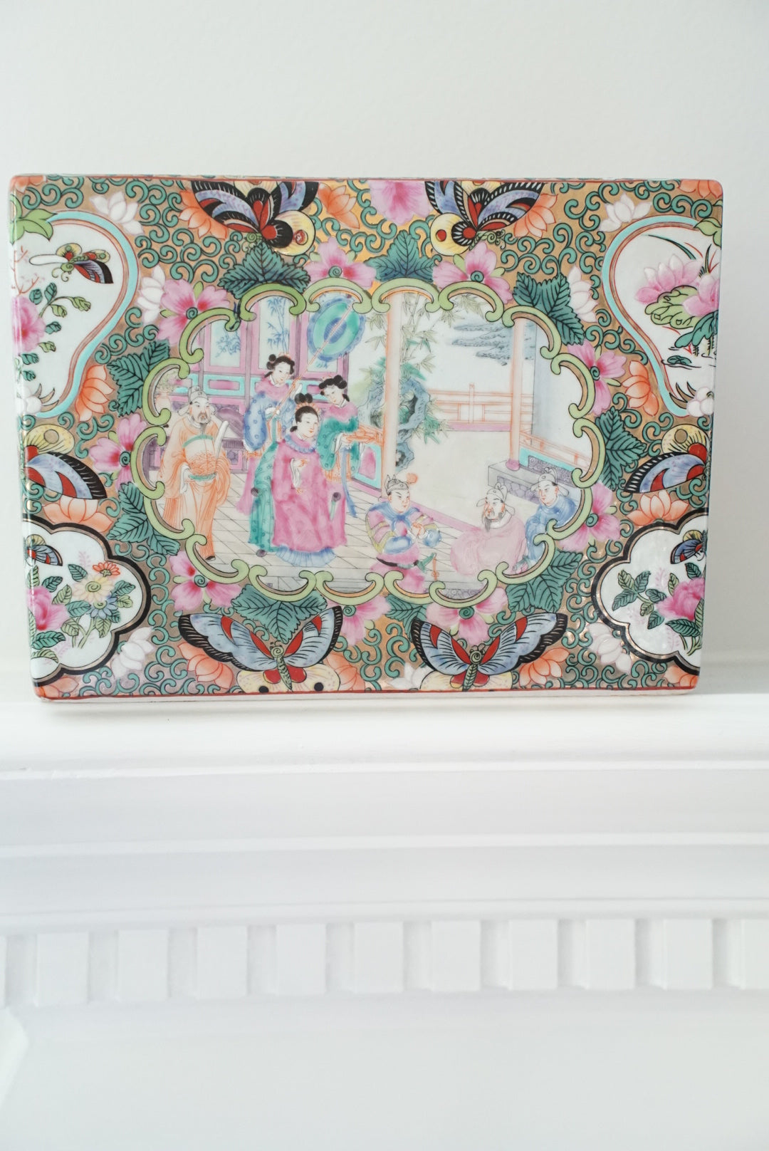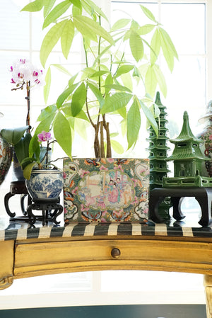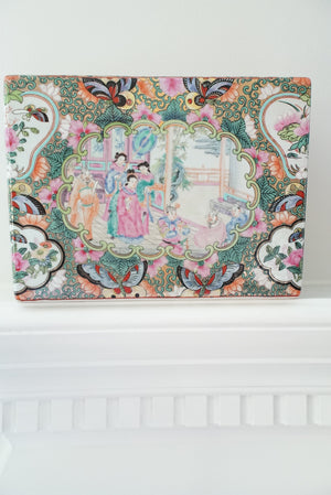 - Enrobed in golden base, beautifully hand painted center panel with court scene and scalloped frame; side panel with blooms, butterflies and birds