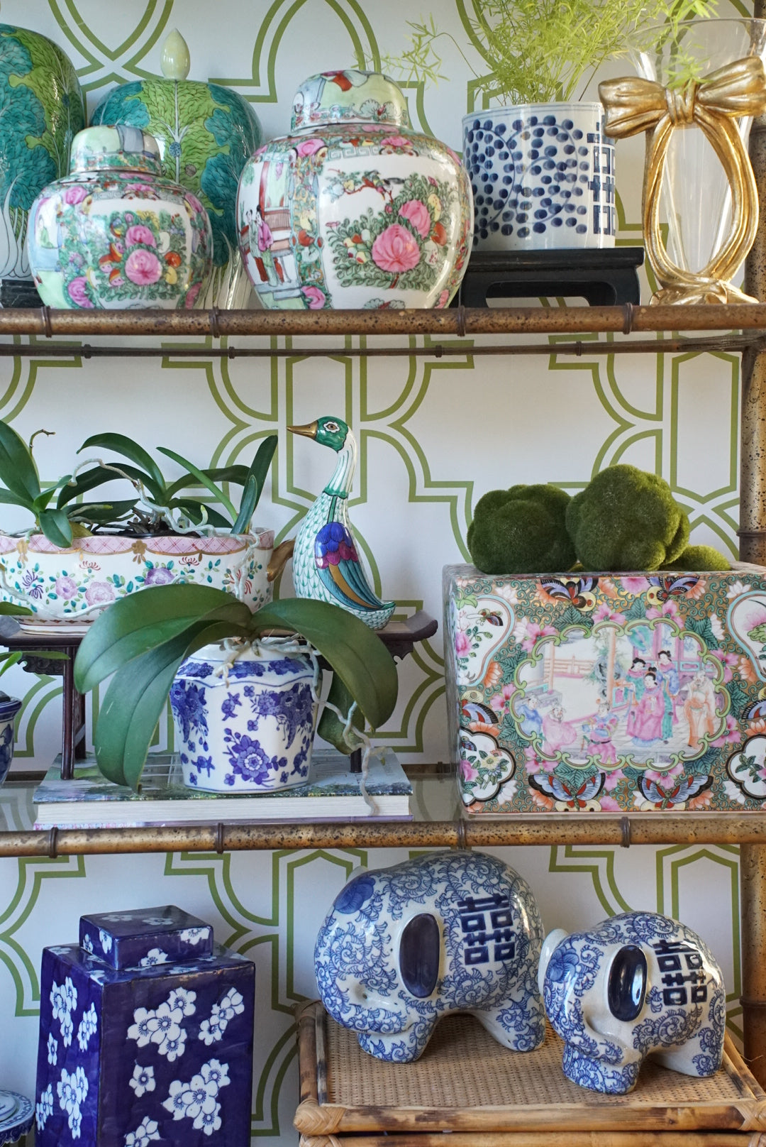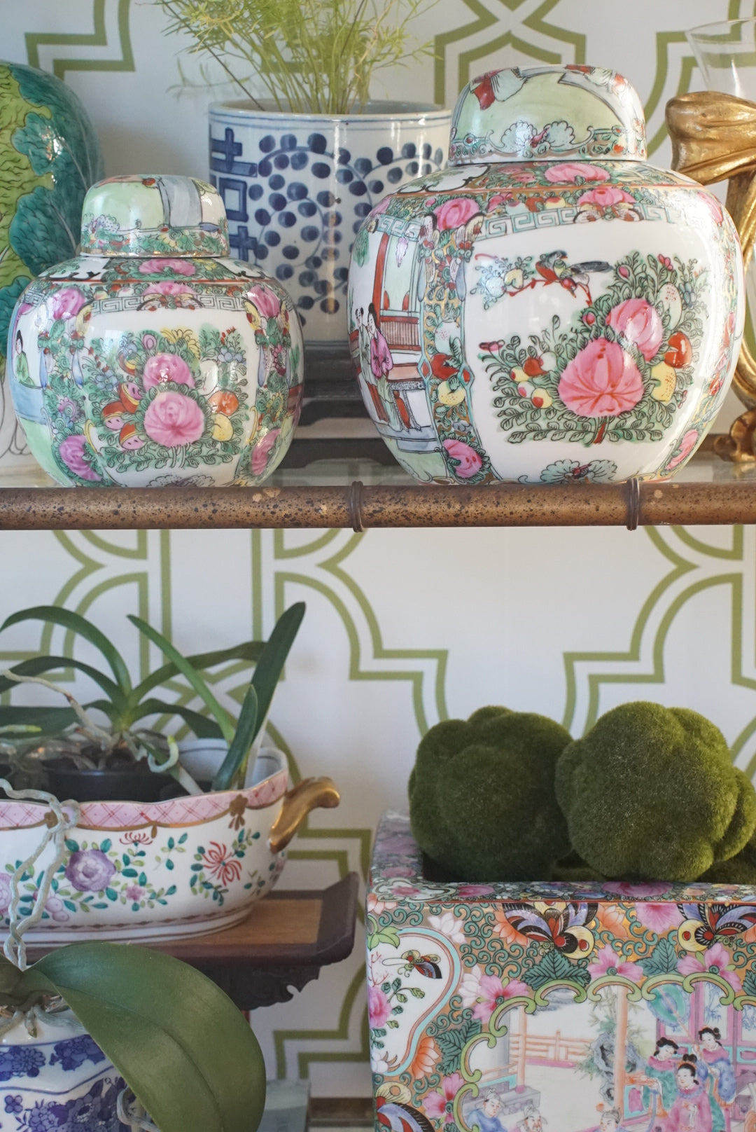 - While every rose medallion piece highlights a different hue, this ginger jar is covered with vibrant colors and shows off pink and chartreuse