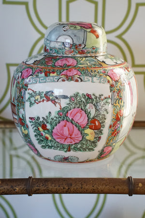 - A darling rose medallion ginger jar loaded with classic four alternating figural panels and floral panels, bordered with Greek keys and butterflies