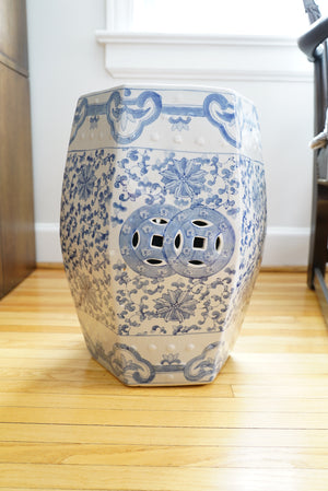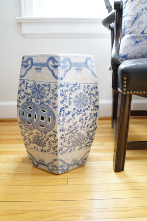 - A beautiful hexagonal garden stool crafted in beautiful blue glaze on white porcelain