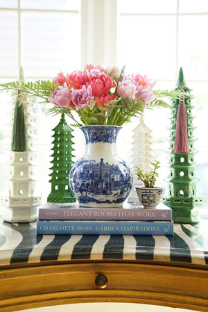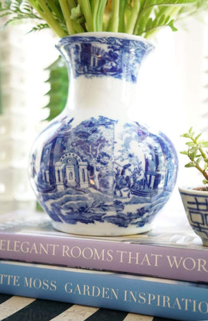 - A gorgeous fluted Victoria Ware vase with classic and timeless flow blue pattern that wraps around the vase body. It is quite heavy for its size