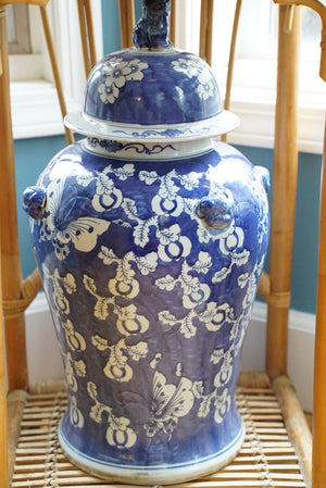 - Fantastic extra large temple jar with floral and butterflies in deep blue and white