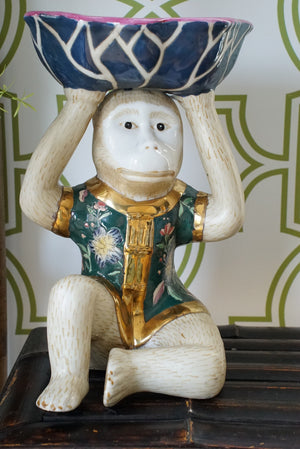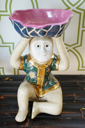 - A handsome extra large chinoiserie monkey wearing a green floral vest with gold gilt while holding a pink and blue bowl